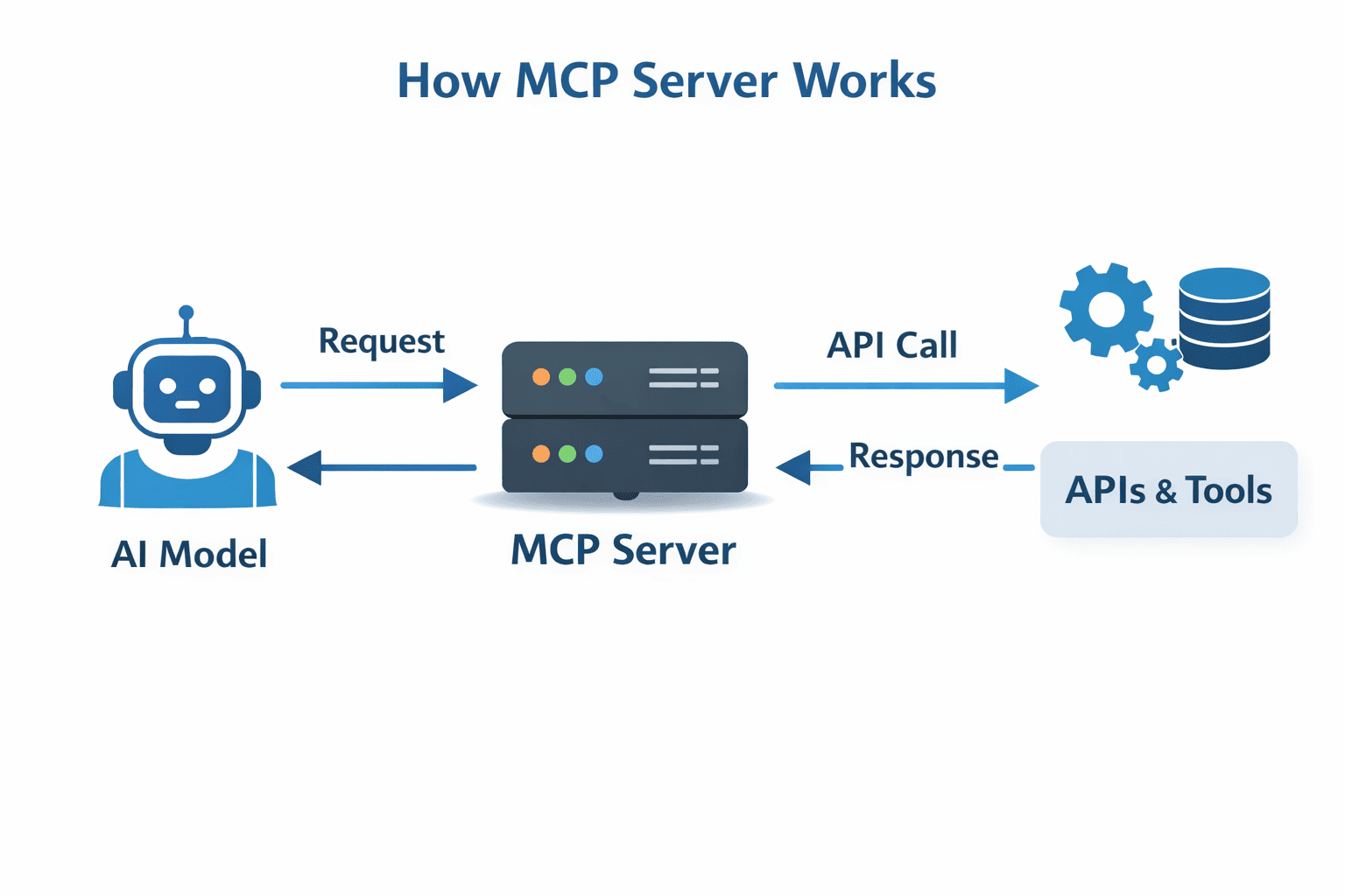 MCP Server is a bridge between AI models and external systems. It allows AI to call tools, fetch real-time data, and perform actions.